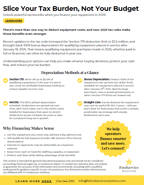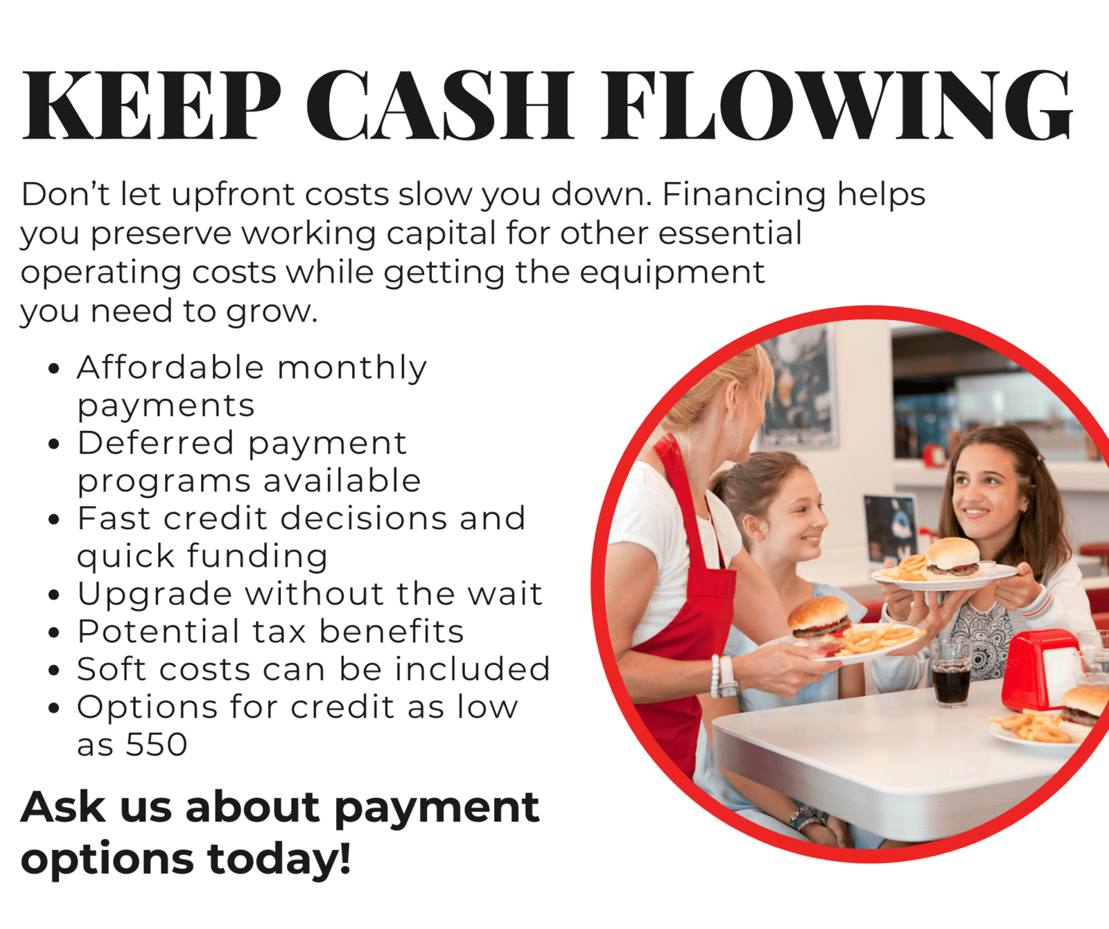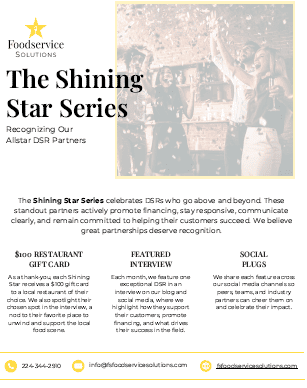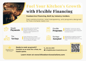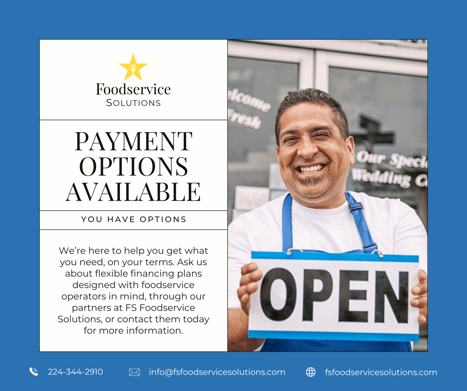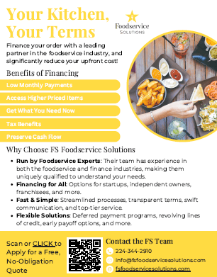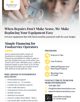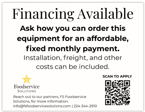 The items in this section are designed to be used in showrooms, on-site, or at trade shows to help dealers proactively promote financing. Many customers don’t realize that financing is available for commercial equipment, or they may feel uncomfortable asking about it. Having visible materials on hand makes it easier to start the conversation and can lead to more closed deals. Email Kim@fsfoodservicesolutions.com for more information on physical materials.