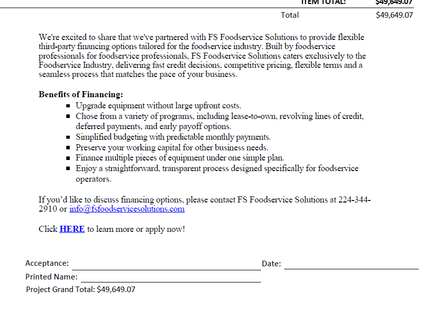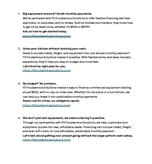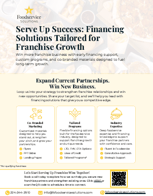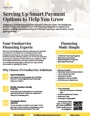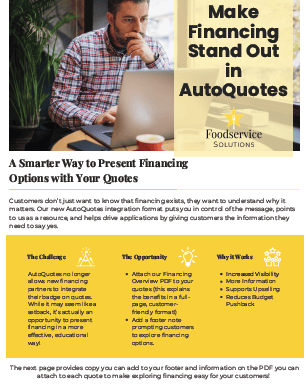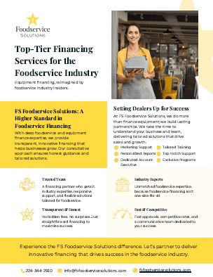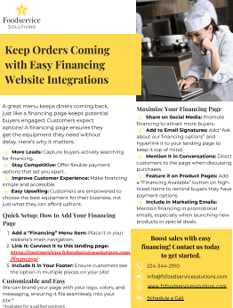 This section is packed with tools to help your team understand, promote, and maximize financing. From training guides to talking points and integration tips, these resources are built to help you close more deals and make the most of your FS Foodservice Solutions partnership.